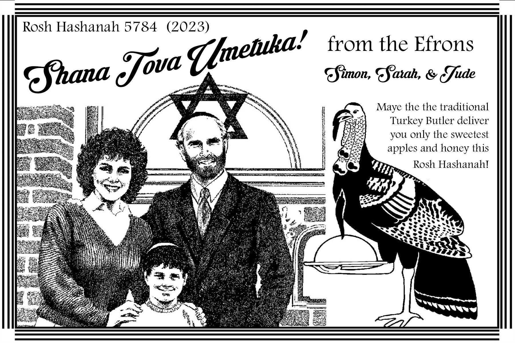 This is a Rosh Hashanah greeting card from the Efron Family (friends of mine from Sacramento). I was pleased to see them include the traditional Turkey Butler, which solemnly brings sweet treats to the family and guests before skulking away to be harvested by protestants a month later.