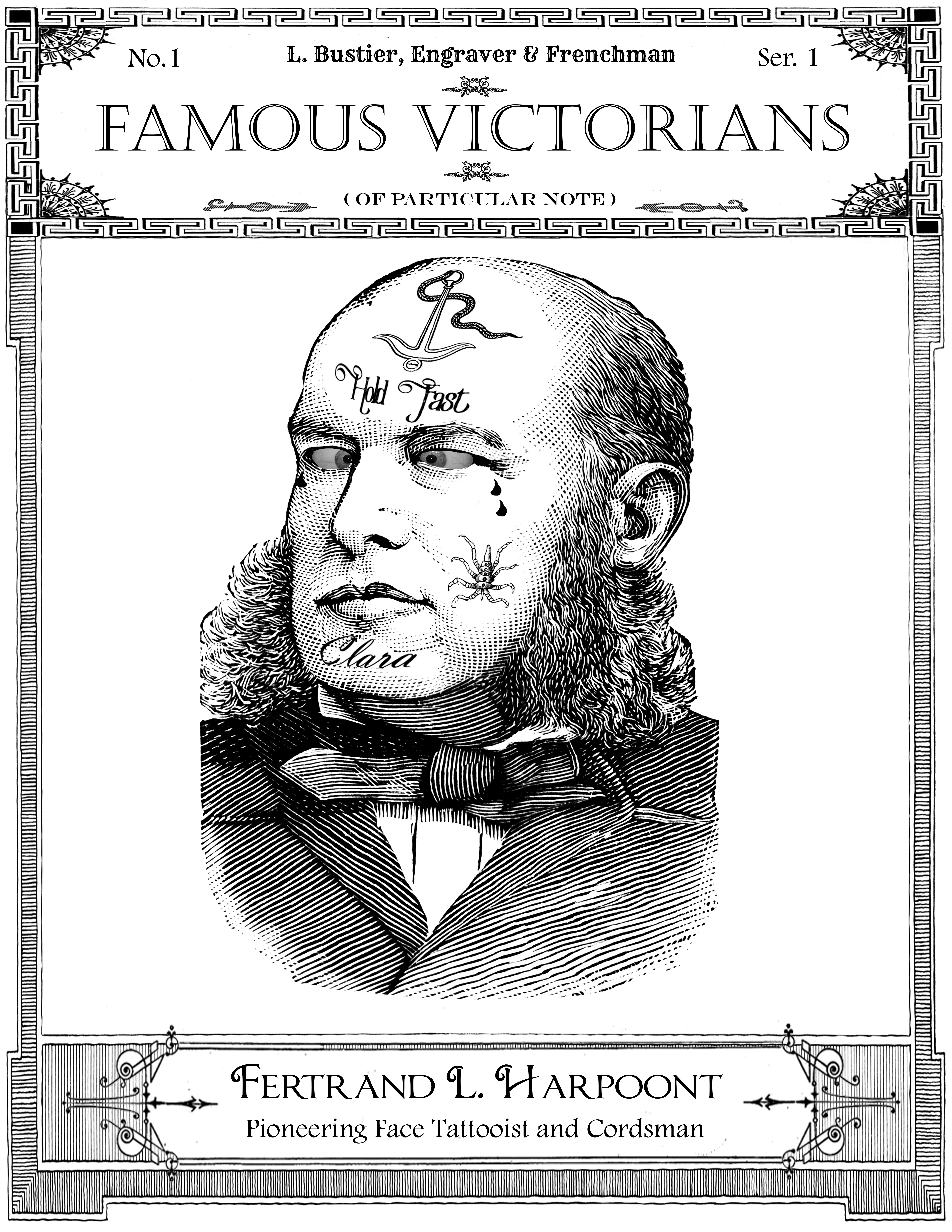 Fertand L. Harpoont was best known for applying and popularizing facial tattoos between 1868 and 1875. He learned the practice from the Denimese people whilst convalescing on the Isle of Sinalindin after a a failed test of his “gloveless electric eel retrieval technique.”